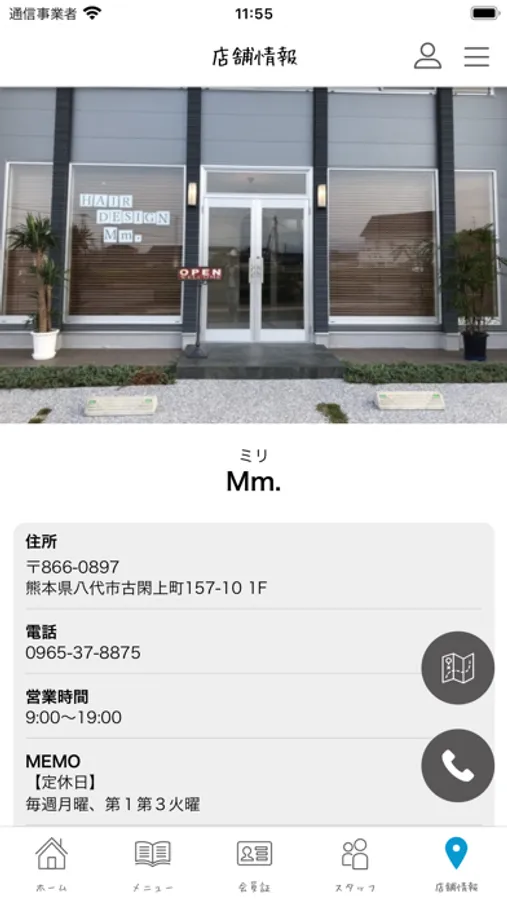 店舗のマップが表示され、地図アプリとも連携しているので、初めてのご来店の時も簡単に見つけることができます。