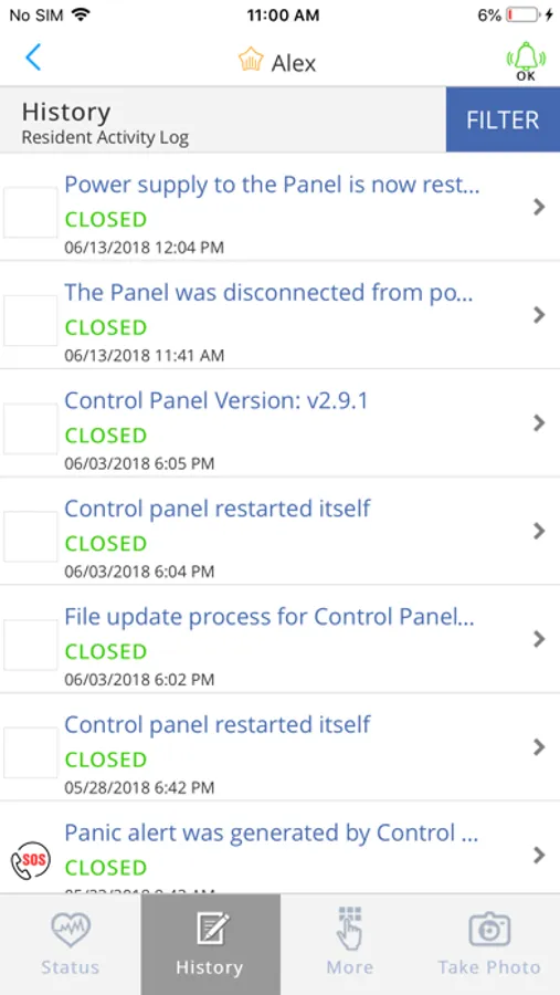 The app provides day story reports, shows movement levels to indicate how active the resident is, as well as a history of events.