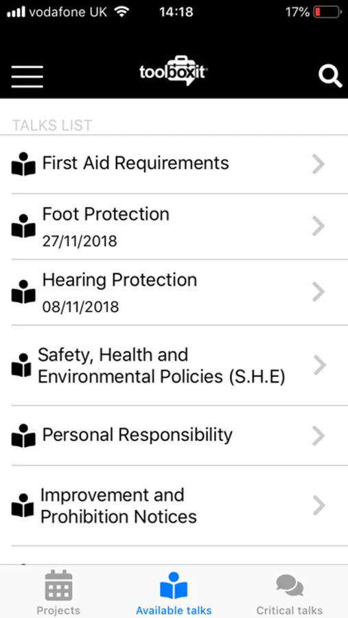 The Toolboxit App is the only app currently available in the UK that is based solely for the UK construction industry. It allows all companies from painters, plumbers right through to general contractors to easily carry out toolbox talks on a daily basis on all your project sites