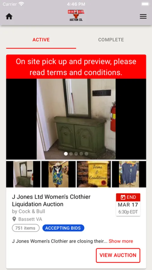 Welcome to the Cock & Bull Auctions mobile bidding app! This dynamic app allows you to (1) stay informed about our upcoming auctions; (2) view properties that interest you; (3) get notifications when you’ve been outbid; (4) bid no matter where you are located (or set and forget your maximum bid to let our platform automatically bid the lowest possible winning bid for you). This is the go-to-source for up-to-the-minute information on all of our auctions and listings.