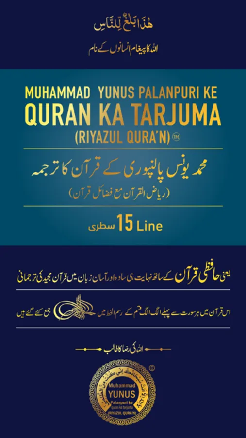 Riyaz-ul-Quran 15 Line (Urdu Translation of Holy Quran by Hazrat Maulana Muhammad Yunus Sahab Palanpuri DB) .In which the Quranic texts and translations are written in a large font size, so that the persons with weak eye vision can also easily read it. Furthermore, Every Surah is beautified with Bismillah written in different calligraphic styles.