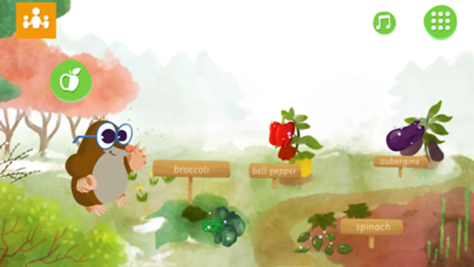 The app is split into four seasons, each of which is further divided into three sections: exploration of vegetables under the guidance of an adult, recording of vegetable tasting sessions (taste bank) and mini-games that can be freely played in Mole’s World. The vegetables selected for exploration are grouped by season, broadly based on harvesting periods. Each season includes six vegetables that can be found in Mole’s World. A learning section intended to be used under adult supervision can be opened by tapping on the image of a given vegetable. The purpose is to talk about the vegetable, find out about its properties through various tasks, and play games.