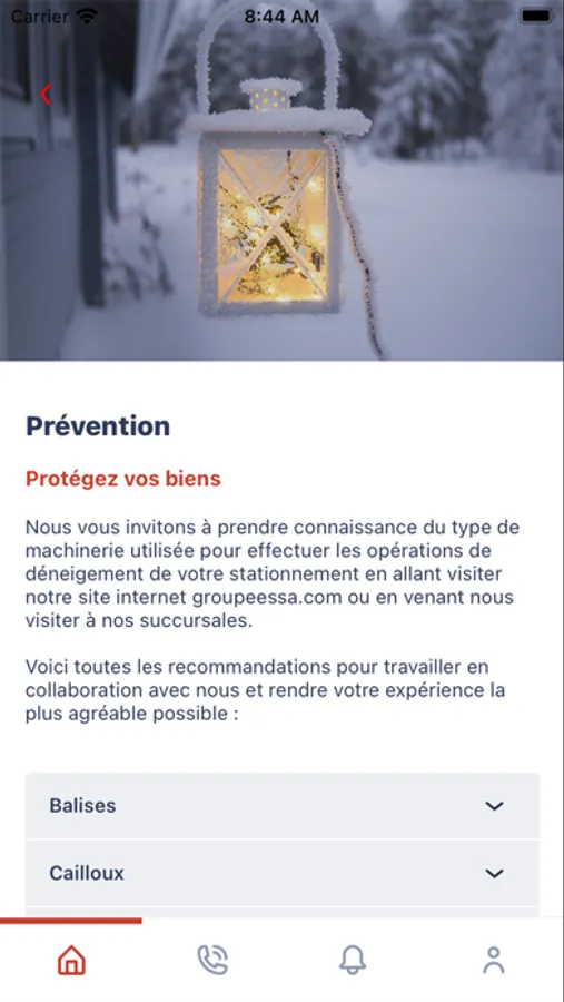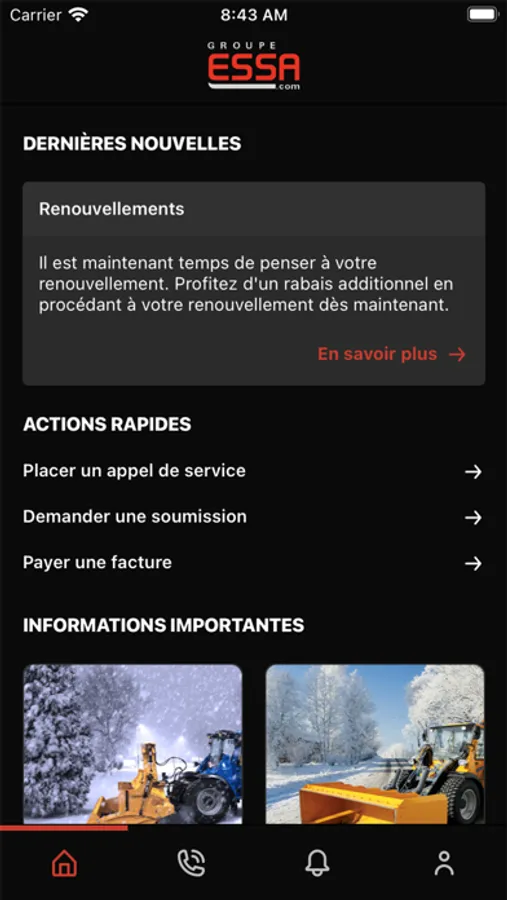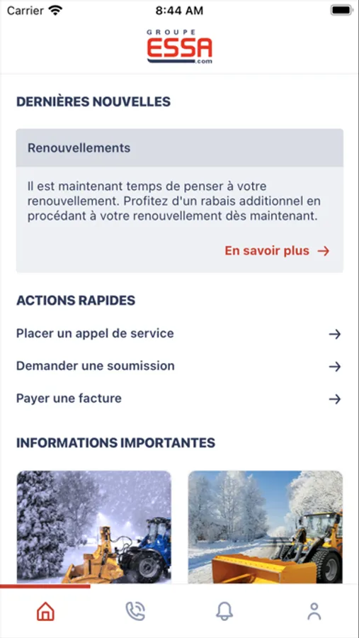 Grâce à l'application Groupe ESSA, recevez des notifications pour les opérations de déneigement, pour le dernier passage de votre opérateur dans votre secteur, pour vous aviser du début des services, pour vous informer des alertes insectes durant l'été et rester à l'affût des promotions à venir. Vous pourrez aussi nous contacter facilement et même signaler la présence d'une gratte de ville dans votre secteur!