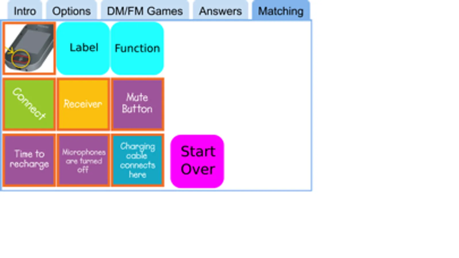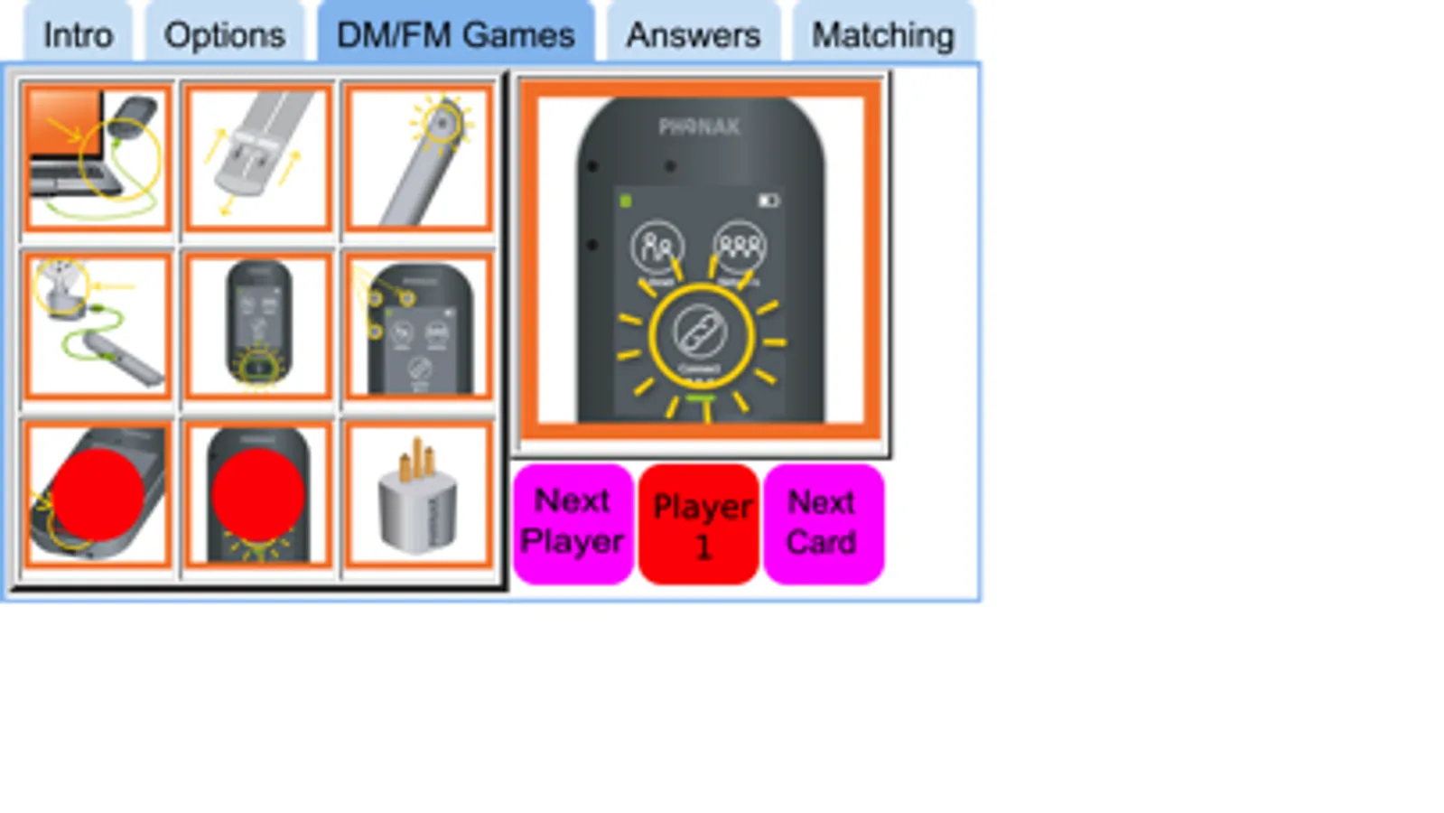 Would you like a convenient, quick, brain-based way to teach how to manage Phonak's Roger Touchscreen Mic DM system? This technology is used by people who need it to auditorily access their environments. In order to keep auditory access, users must know how the DM system works so they can learn to troubleshoot. Using a fun matching game, this app teaches the basic labels and functions of the parts, then uses that knowledge to play Bingo and TicTacToe games. Answers are included. Parents, classroom teachers and other professionals who work with students with hearing loss as well as users themselves will find this app invaluable.