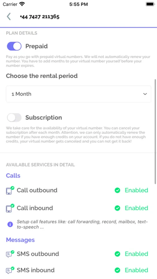 Subscription Plan: Optional you can set the phone number to subscription plan. Blacktel take care to renew you number every month. Please make sure you have enough credits on your account, otherwise your number gets deleted.