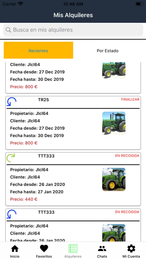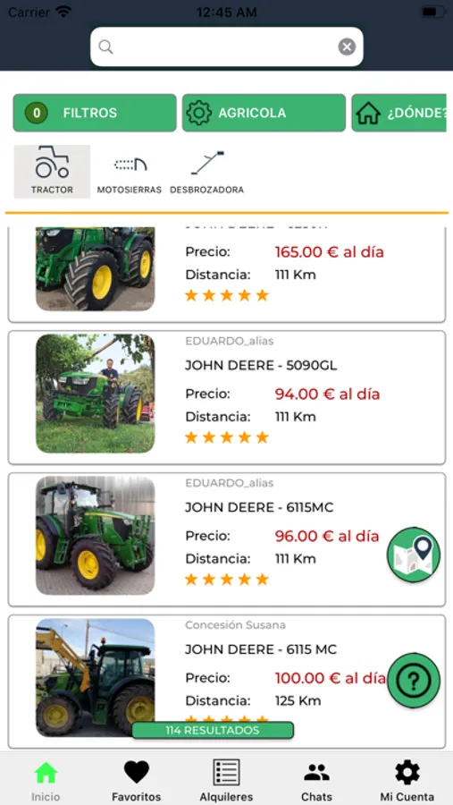 1. Busca el equipo que necesitas. Desde un taladro a una cosechadora de cereal. Utiliza el árbol de selección. Usa los filtros para ajustar mejor la búsqueda, y define las fechas de la solicitud.