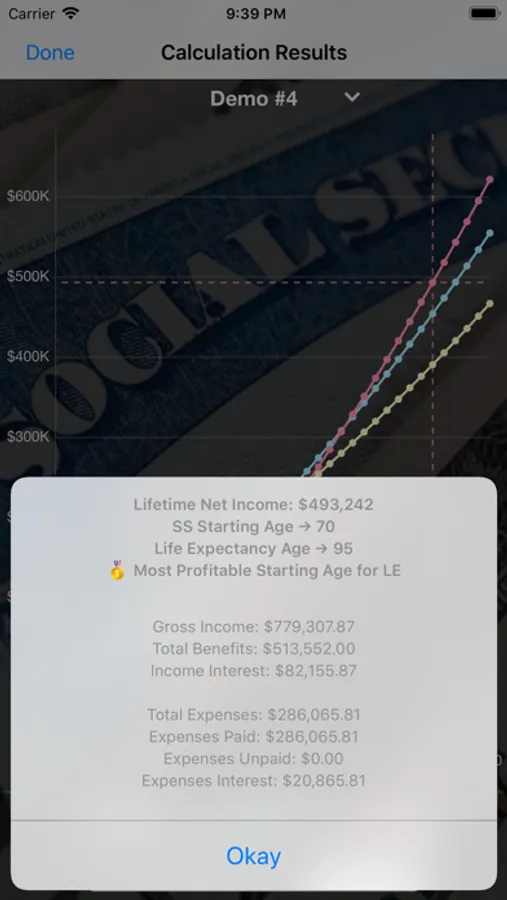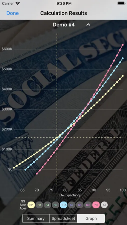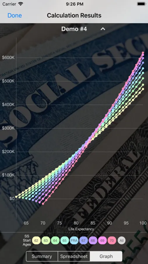 • Graph - calculation results displayed as lines depicting estimated lifetime net income for each Social Security starting age. Clearly illustrates the differences in lifetime net income for all benefit starting ages. Any starting age line can be toggled on or off. Tapping a point on the graph will display more detailed information. Supports zooming to show increased granularity.