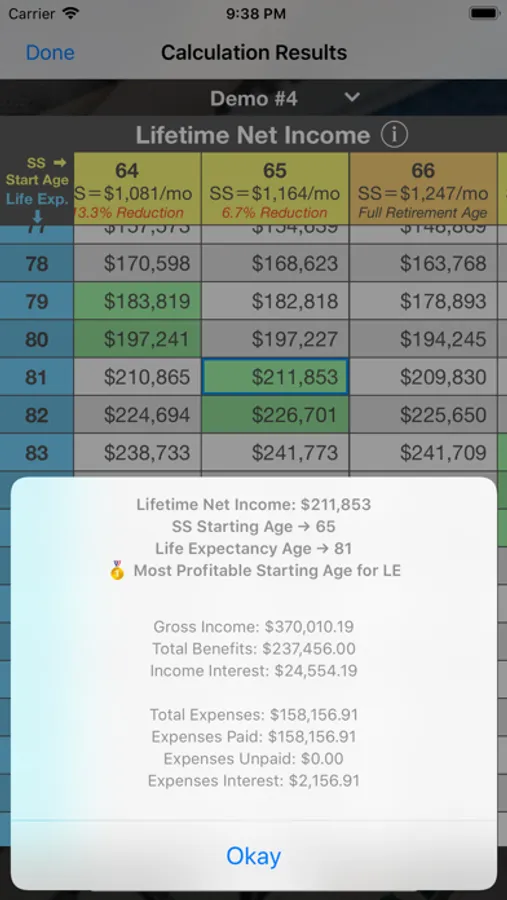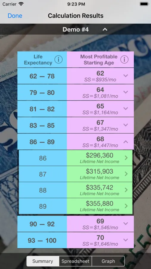 • Summary - a table of life expectancy ages with their most profitable starting ages for benefits. Rows can be expanded to show your estimated lifetime net income for every life expectancy age. The lifetime net income rows can be tapped to highlight the corresponding cell in the Spreadsheet.