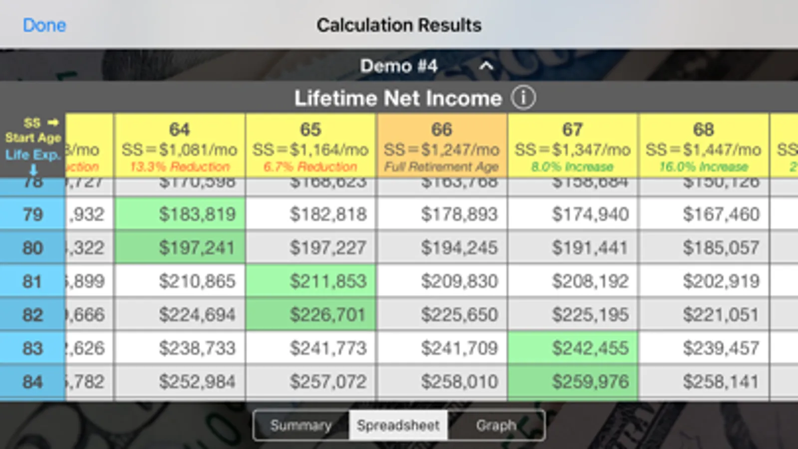 • Spreadsheet - detailed spreadsheet format showing your estimated lifetime net income for all Social Security starting ages and life expectancy ages. Each lifetime net income cell can be tapped to show more detailed information. The differences in lifetime net income amounts can be easily examined for all benefit starting ages.