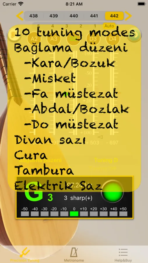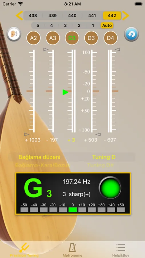 - Calibrate Piano Sound : Click on an open string then calibrate the sound with your Baglama. Piano Sound A4=442.