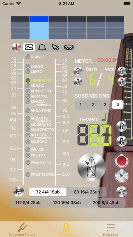 - Intuitive beat mode selection, 18 types, including: Grave 25-45 / Largo 40-60 / Lento 45-60 / Larghetto 60-66 / Adagio 66-76 / Adagietto 72-76 / Andante 76-108 / Andantino 80- 108 / Marcia moderato 83-85 /Andante moderato 92-112 / Moderato 108-120 / Allegretto 112-120 / 116-120/ Allegro 120-156 / Vivace 156-176 / Vivacissimo 172-176 / Presto 168-200 / Prestissimo 200 Bpm and over