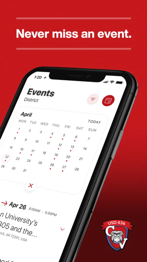 The event section shows a list of events throughout the district. Users can add an event to your calendar to share the event with friends and family with one tap.