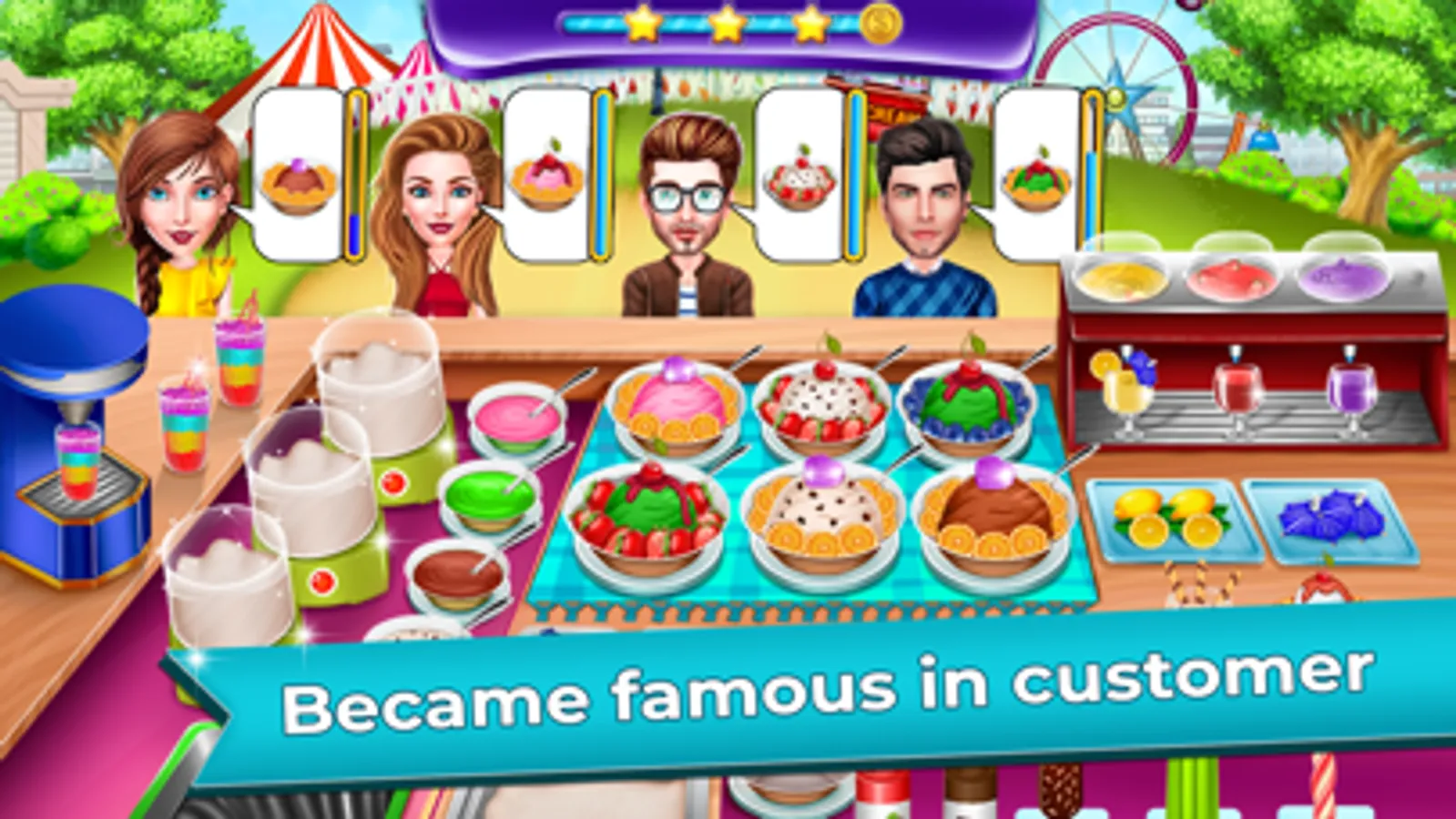 Hey Ice Cream Lovers!!! This game is made for you guys. The ice cream shop involves a variety of ice cream cones, scoop ice cream cup, Cup cakes, pastries, cookies, pie, donuts, candies, juice, cold drinks and so many tasty toppings. You need to serve the ice cream as per customer's requirement. Use boosters to have a fantastic gameplay, face the difficulties to achieve the level targets and many rewards are waiting for you. So play this game and enjoy an awesome gameplay experience. Don't forget to share this game with your friends and family.