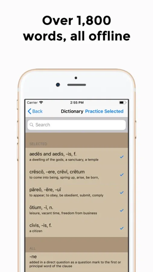- Relego's offline dictionary contains over 1,800 entries, searchable in Latin and English. Specific word lists can be easily created by tapping entries, allowing for personalized study.