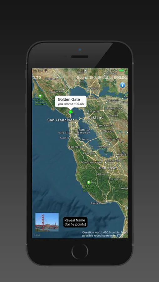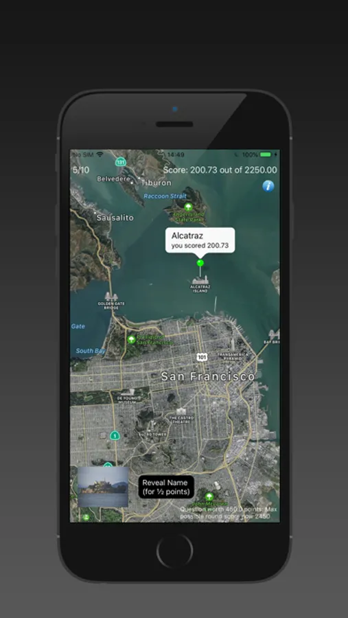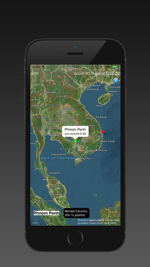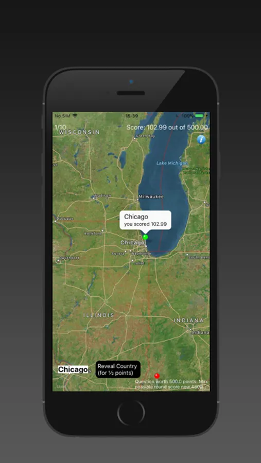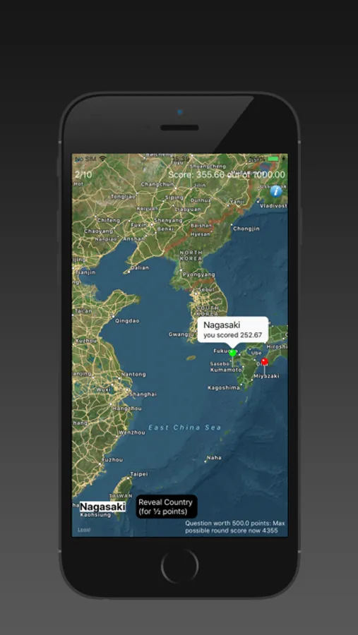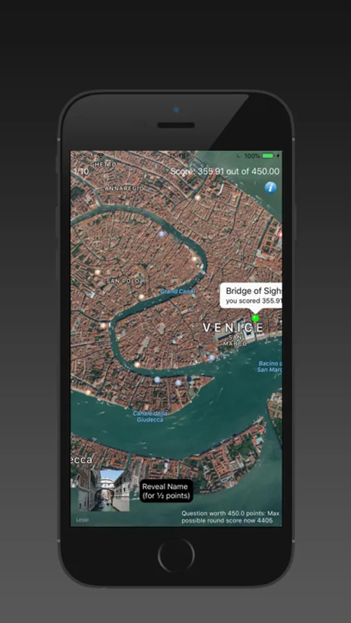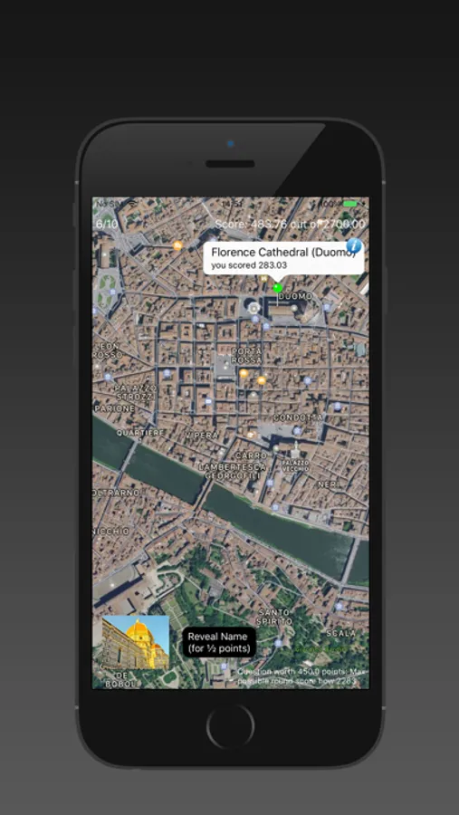 The world map is displayed satellite form (no cities marked on map) but after you guess, the map switches to hybrid form so that you can see not only the correct location, but where it is in relation to other cities and countries. You can zoom right in at that point to see as much detail as desired.