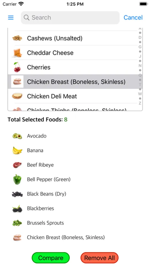 Food Compare lets you quickly compare the nutritional value of different foods in a fun and easy to use format! Contrast the full nutrition profile of two foods head to head, or compare individual nutrients of up to 10 foods at once!
