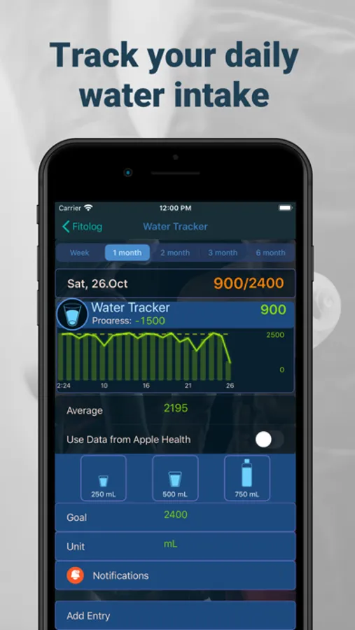 Possibility to set daily goal of water and food consumption. Easy way to add water, calorie and protein intake entry. Progress checking by periodical graph. Notifications for water intake.