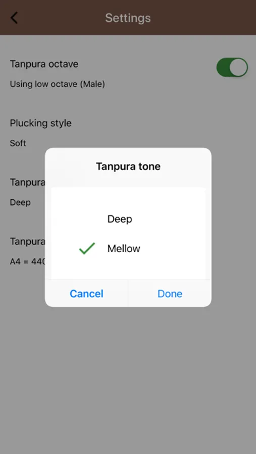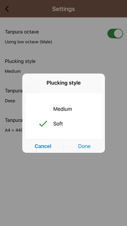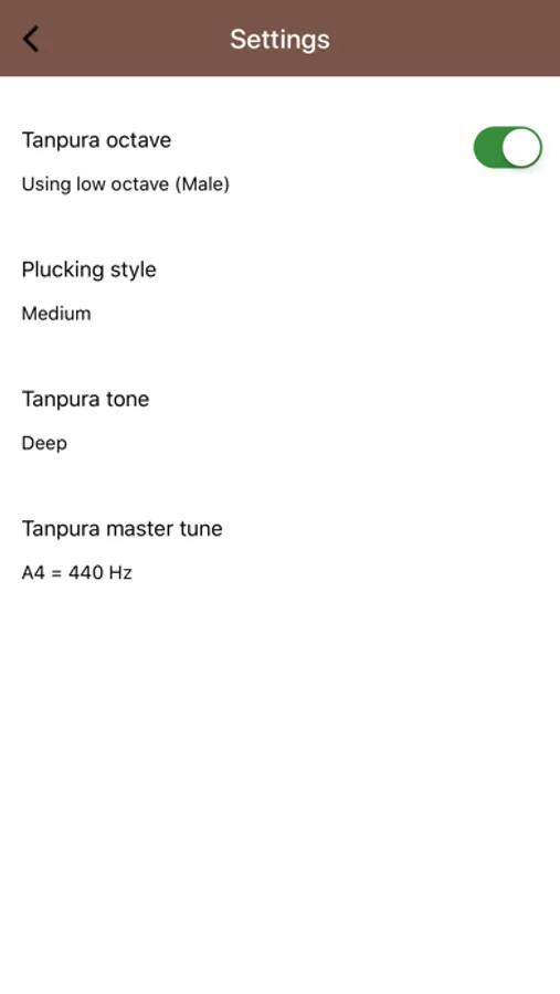 Settings allows choosing Tanpura octave (Low/High), Tanpura tone (Mellow, Deep) and plucking style (Soft, Medium). In addition, the master tuning of the Tanpura can be changed from A4 = 440 Hz (default) to A4 = 432 Hz.