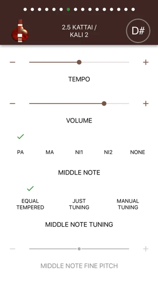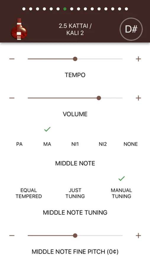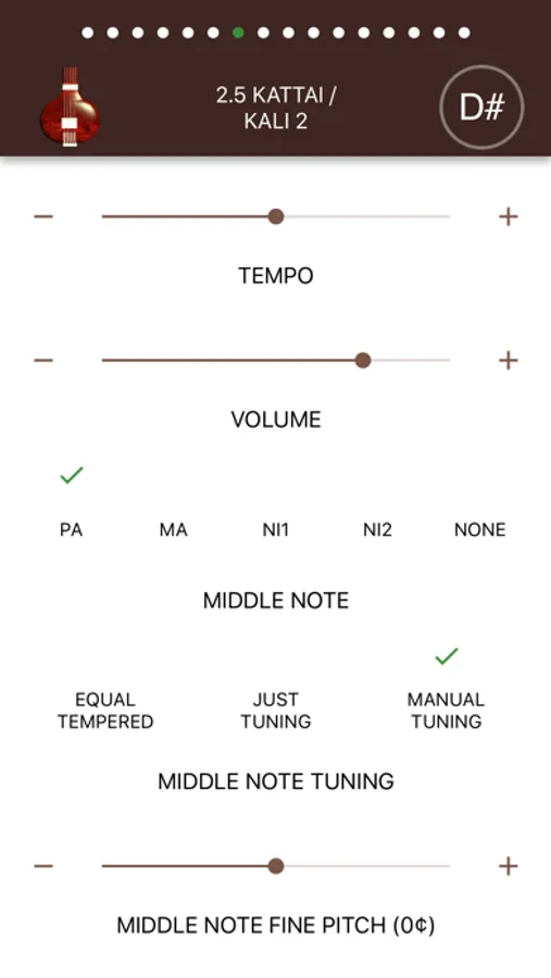 The app allows choosing different middle notes (Pa, Ma, Ni 1, Ni 2, None) and suitable tuning temperaments (Equal Tempered, Just Tuning and Manual Tuning). Equal Temperament is the standard tuning used in modern music, but traditional Indian music typically uses Just Tuning. When Manual Tuning is selected, the middle note (Pa, Ma, Ni 1, Ni 2) can be manually tuned to 1 cent resolution.
