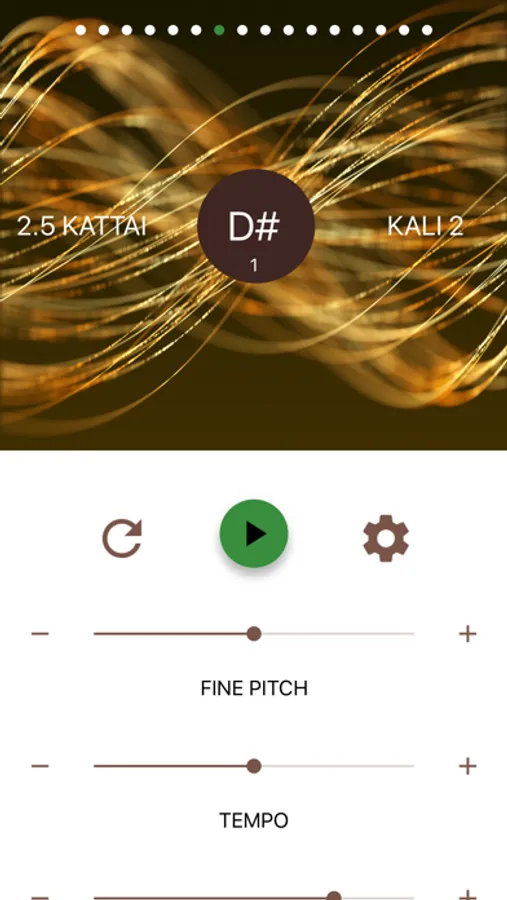 Scroll left or right to choose the appropriate pitch (Shruti). If needed, the pitch can be manually adjusted to 1 cent resolution. The tempo of Tanpura plucking and overall volume of the sounds can also be modified.