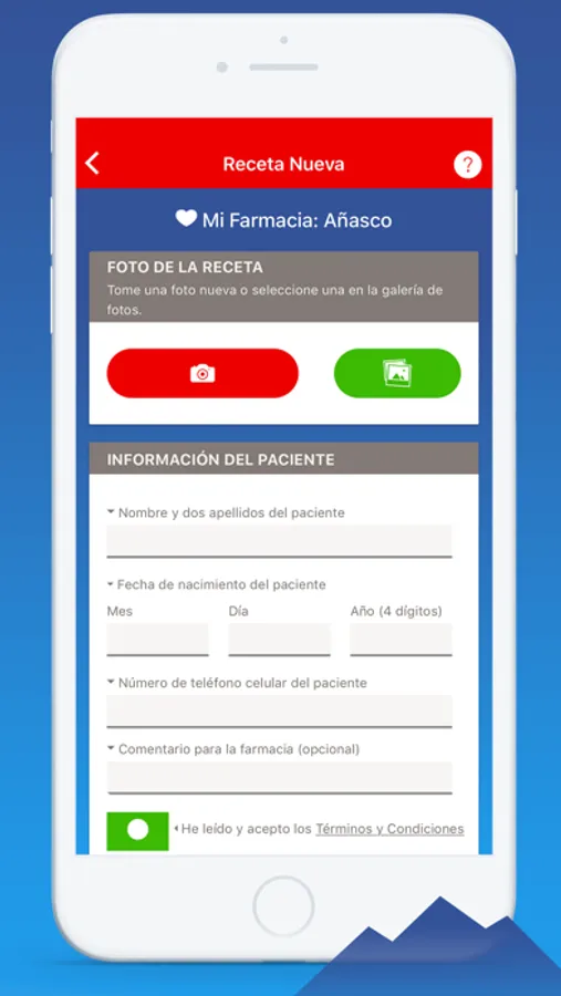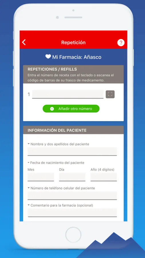 Ahora puede entregar sus recetas nuevas o pedir sus repeticiones directamente desde nuestra app o nuestra pagina de internet sin necesidad de registrarse o crear una cuenta. Simplemente envíenos una foto de su receta nueva o un número de la receta a recargar. Lo que hace de esto especialmente útil es que puede utilizarlo en cualquier lugar, en cualquier momento, incluyendo cuando las farmacias están cerradas. Le informaremos en cuanto su receta esté preparada para que pueda recogerla cuando le resulte más cómodo.
