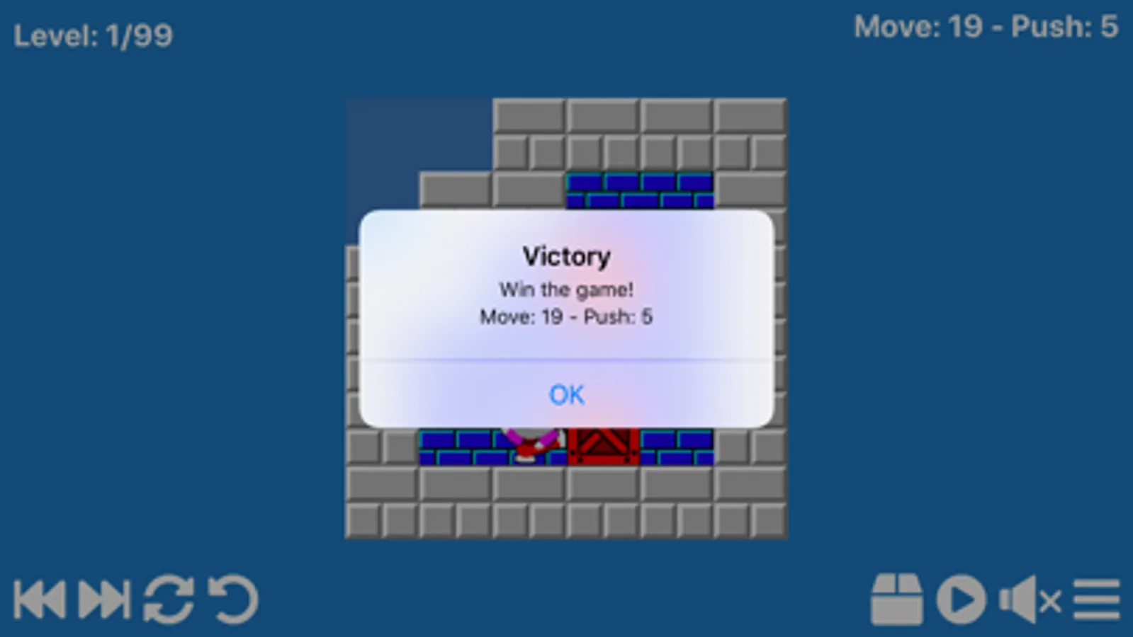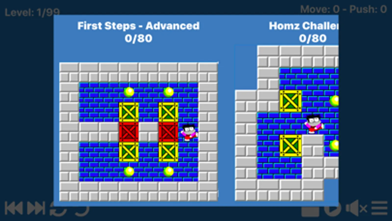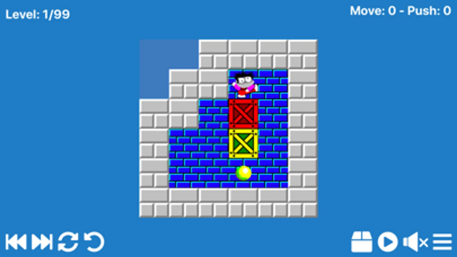 The player is confined to the board, and may move horizontally or vertically onto empty squares (never through walls or boxes). The player can also move into a box, which pushes it into the square beyond. Boxes may not be pushed into other boxes or walls, and they cannot be pulled. The number of boxes is equal to the number of storage locations. The puzzle is solved when all boxes are at storage locations.