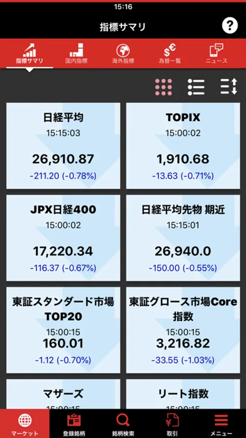 国内外の各種指標や為替情報がご覧いただけます。タイル表示や一覧の表示順序の切替は可能です。