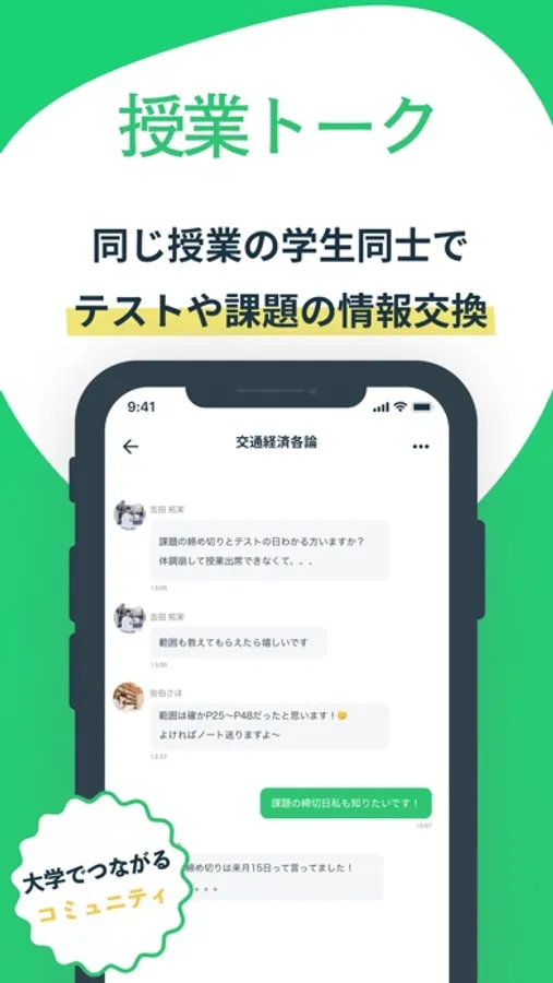時間割を登録すると、講義ごとのトークルームに参加できます。同じ授業を取っている他の学生と情報交換ができたり、ノートやシラバスをシェアすることも可能です。