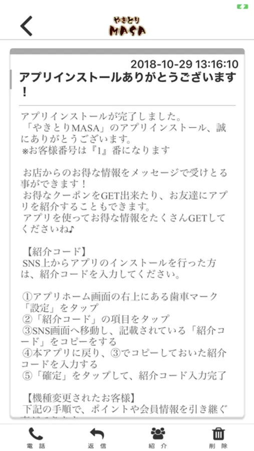やきとりMASAのアプリをSNSを通じてお友達に紹介する事ができます。