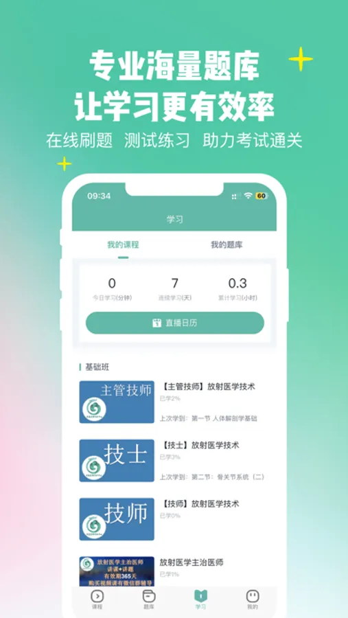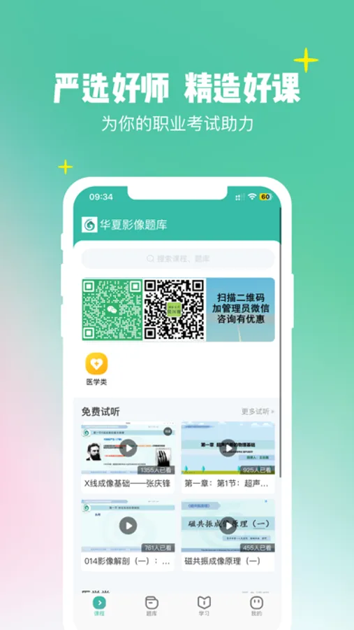 华夏影像题库可以为学员提供海量的试题资源,以及相关专业的网课观看。可以在线考试,每日签到做题,练习做题。