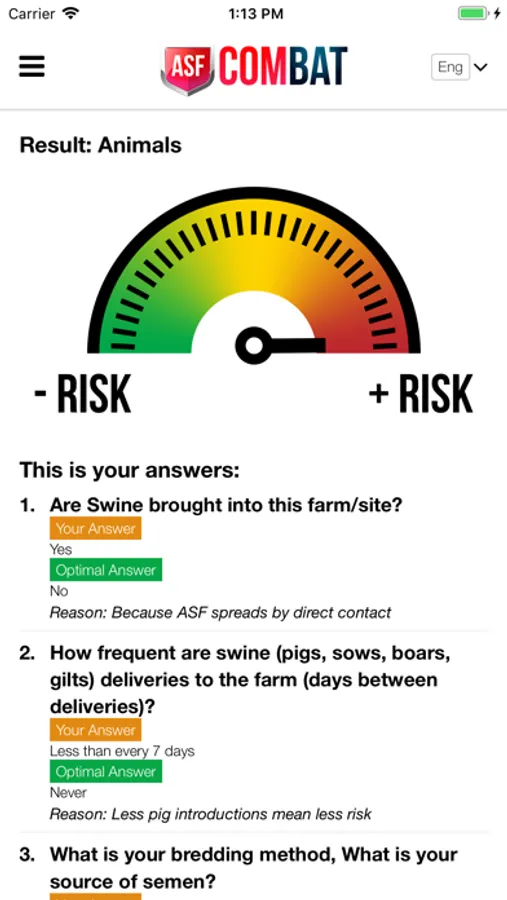 A set of questions based on the known biosecurity risks for ASF provides an indicative risk score and gives you optimal solutions to build and maintain the highest possible biosecurity around your farm, so you have the best odds to prevent African Swine Fever.