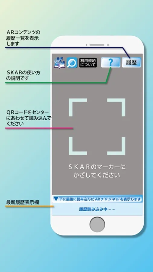 アプリをダウンロードして、アプリ内のカメラからSKAR用のQRコードにかざした後、コンテンツ毎のARターゲットにアプリ内のカメラをかざすと、ARを楽しむことができます。