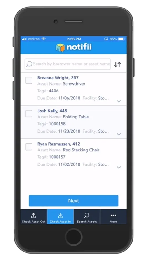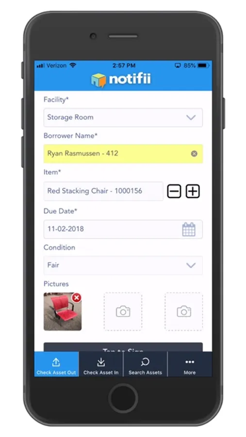 Notifii Checkout is an asset tracking system. Easily “check out” an item when someone borrows it. Easily “check in” an item when they return it. Automatically remind borrowers to return borrowed items.