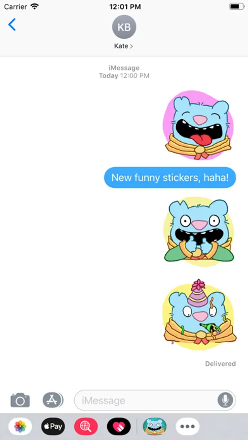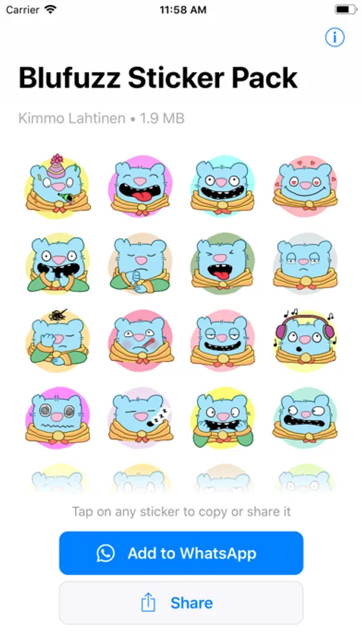 Stickers are compatible with iMessage (animated) and WhatsApp (static). Use the provided app to separately install the stickers to WhatsApp.