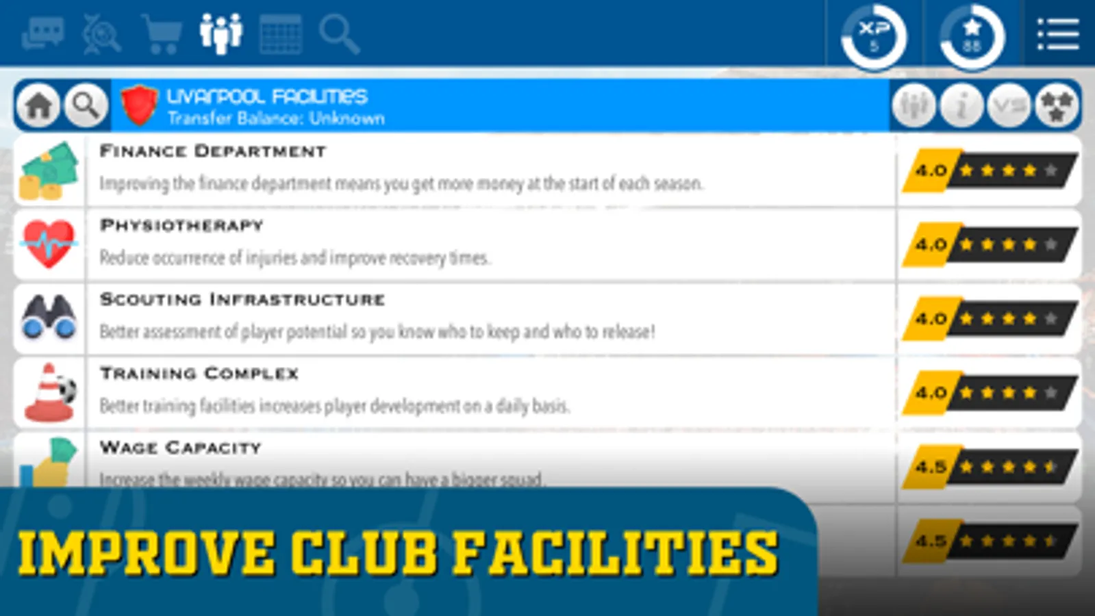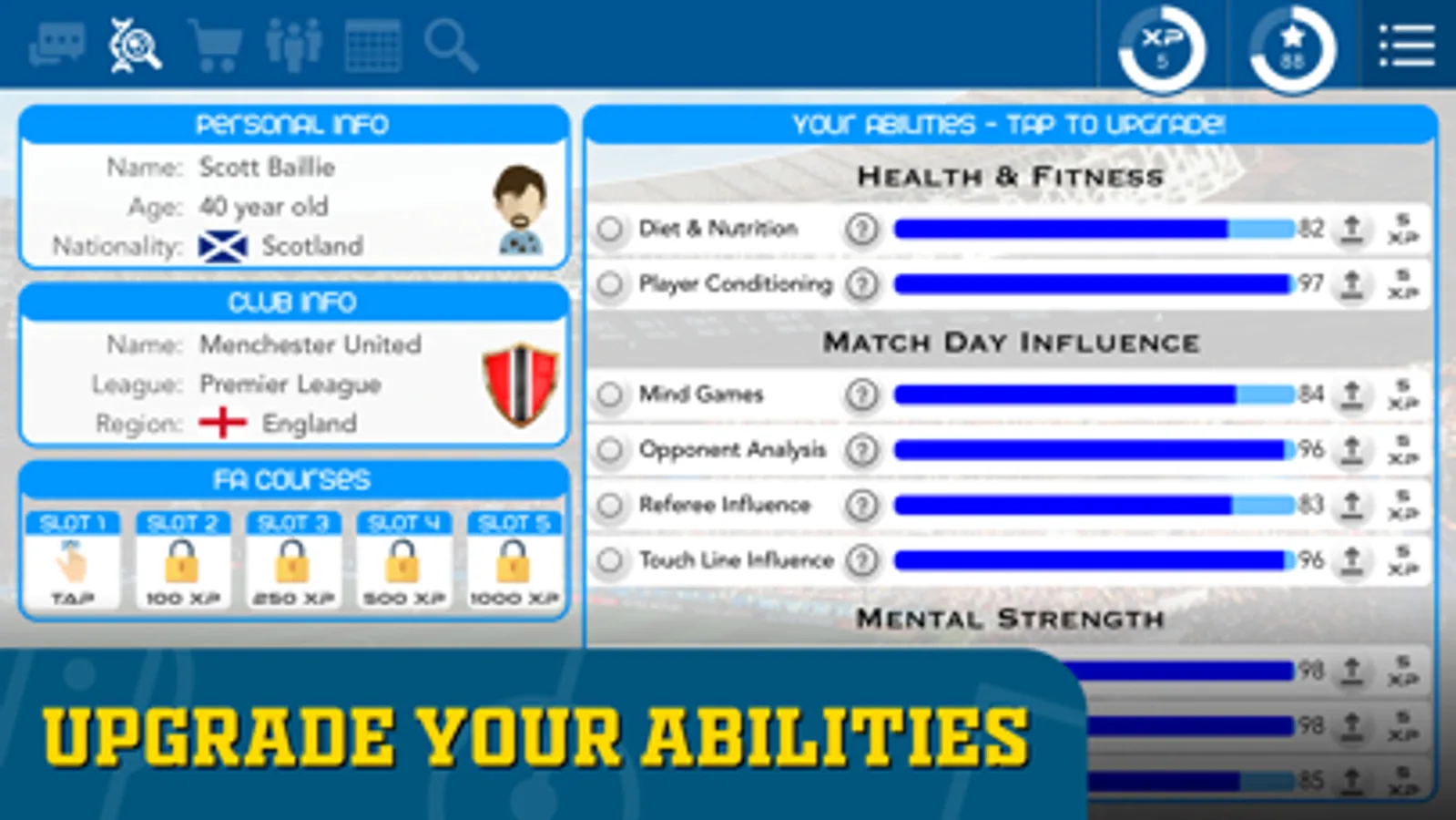 Aside from developing the club, you should develop you own character. Use experience points to upgrade your own personal abilities and become the best manager you can be. Perhaps you focus on becoming a great man-manager or specialise in a specific style of football? More importantly, as you improve, do you stay loyal to your current club or move on to pastures new? After all, that new club could have a much bigger transfer budget!