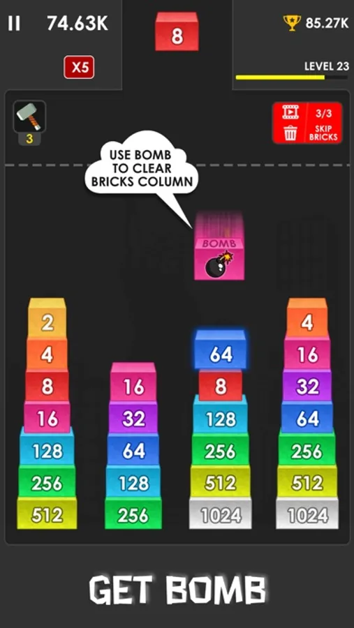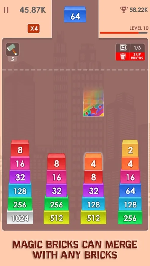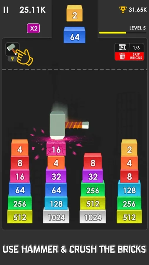 You do it by dragging bricks from top middle bricks stack, if you merge 2 bricks with the same number they will merge and added.