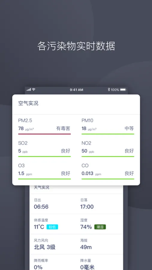实时更新的空气质量实况:中国标准和美国标准下的AQI,以及PM2.5、PM10、SO2、NO2、CO、O3六种污染物的实时数据。