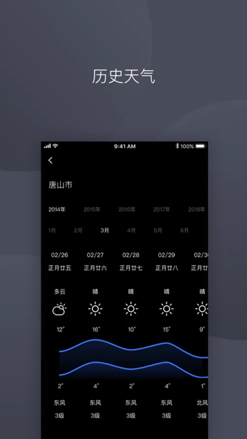 提前买的衣服什么时候可以穿?去远方旅行,怎么准备行囊以适应当地气候?和她约会的那一天是什么天气记不清了?不用担心,打开APP随时查看各个城市最近几年的历史天气数据,可以根据历史数据做购衣计划、出行计划、恋爱备忘。