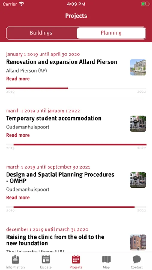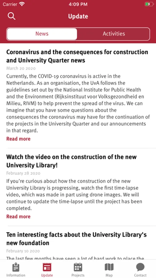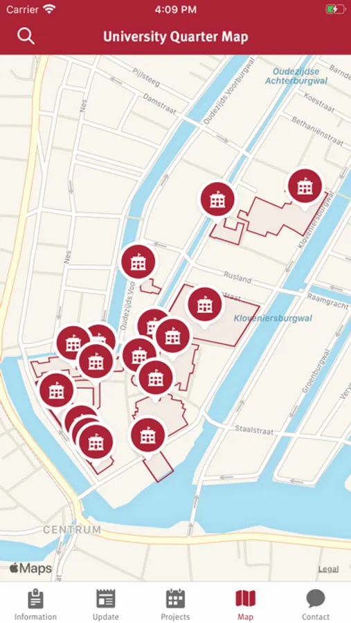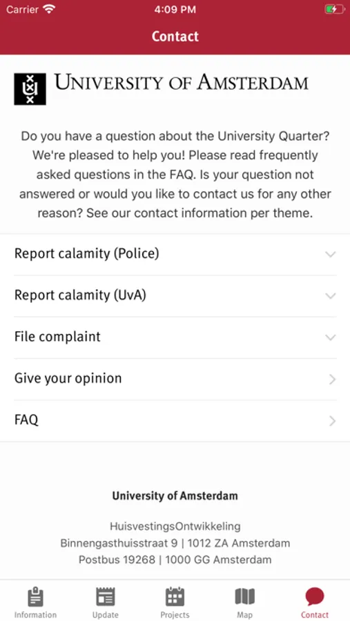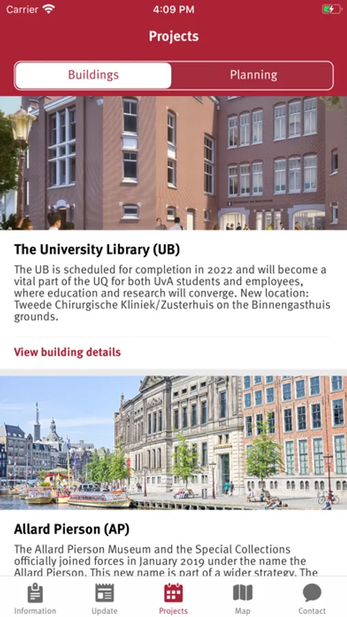 The app shows you, our students, colleagues, neighbours or interested parties everything there is to know about the University Quarter. The app shows the progress of building sites like the University library or the reconstruction of the Allard Pierson Museum. You can easily see what happens where and what building is involved. The app keeps you up-to-date on news and planned events and offers the possibility to contact the university, ask questions, participate in polls or report on unwanted events at the construction sites.