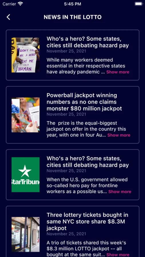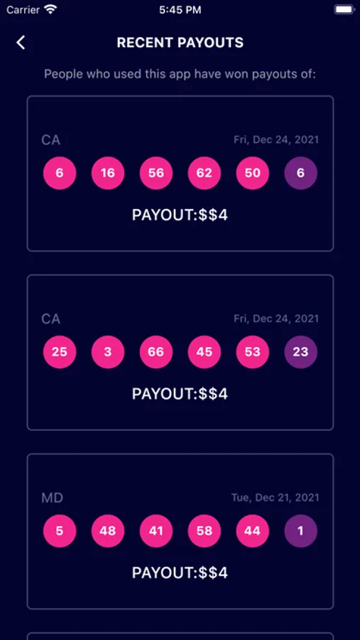 Check your lotto tickets by overviewing the winning lotto numbers within the app. Go back and check the recent payouts and winning numbers for the last weeks and months.