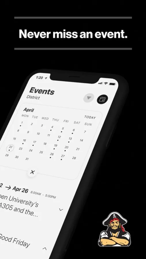 The event section shows a list of events throughout the district. Users can add an event to your calendar to share the event with friends and family with one tap.