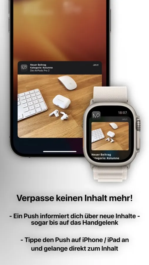 Aktiviere den Push und verpasse keinen neuen Artikel mehr. Die App informiert dich dadurch über neue Beiträge der verschiedenen Kategorien, über neue offizielle Softwareupdates für iPhone, iPad, Apple Watch, Mac und Co., über eine neue Episode des Kolumnen-Podcasts und gibt dir gelegentlich auch eine kleine Randnotiz als Push mit in den Tag. Im Menüeintrag „Angebote“ erhalten Sparfüchse wöchentlich neue Angebote rund um Apple-Hardware.