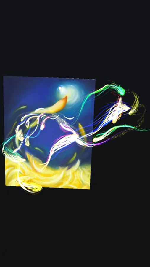 Point your device at the '2D artwork' to see Augmented Reality that is integrated to enhance the narrative, emotion and energy of the work. Adding a meta-physical, inter-dimensional layer for further contemplation.