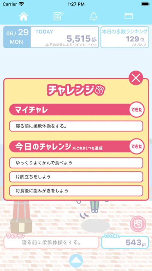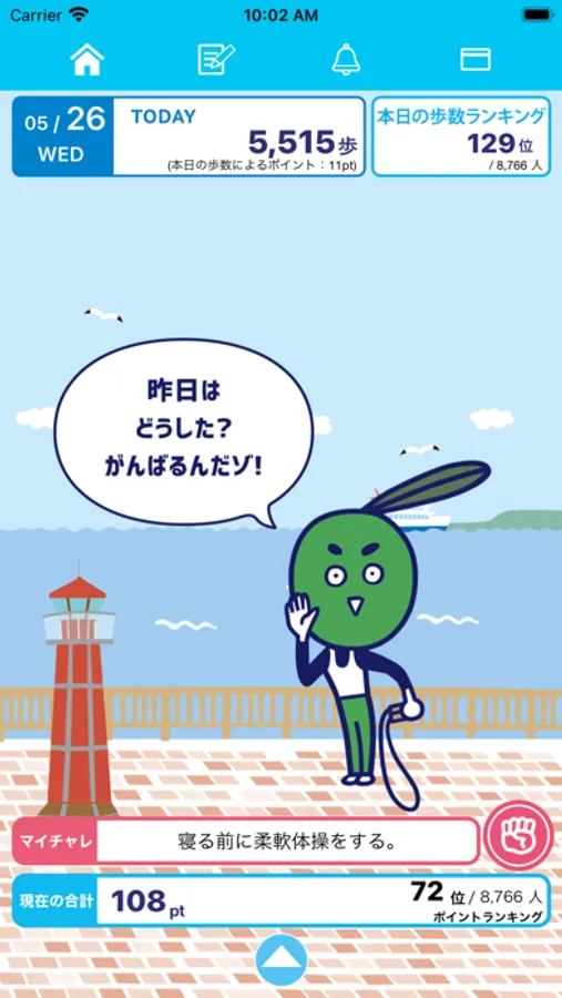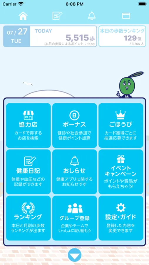 日ごとに歩いた歩数をカウントし、健康ポイントに還元していきます。最初に選んだキャラクターたちが、あなたを毎日応援してくれます。
