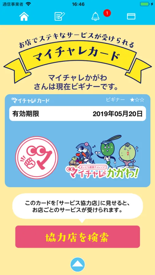 ○協力店でのサービスはビギナーカード取得時から受けられます。カードがランクアップしても、サービス内容は共通です。カードは健康ポイントを達成するとアプリの画面に表示されます。