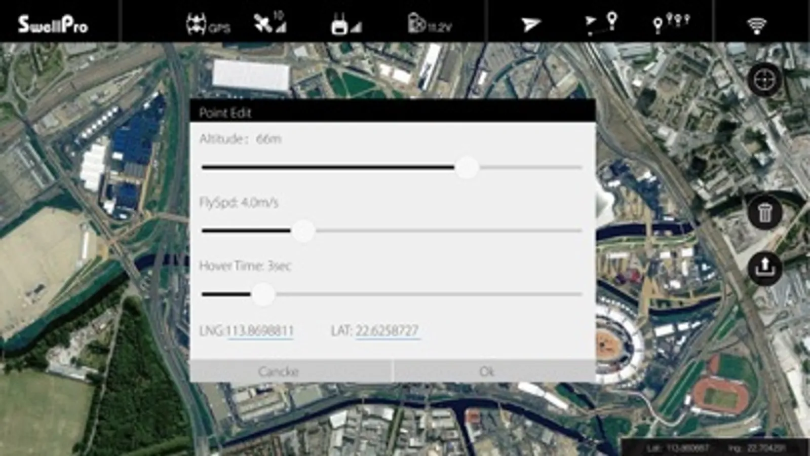 Route/Mission Planning: Tap the “Flight Path Setting” at the top of the screen and tap the map to set the flight path (double tap the flight point to delete it, tap the “Delete” button to delete all flight paths). Tap the flight point again to edit.