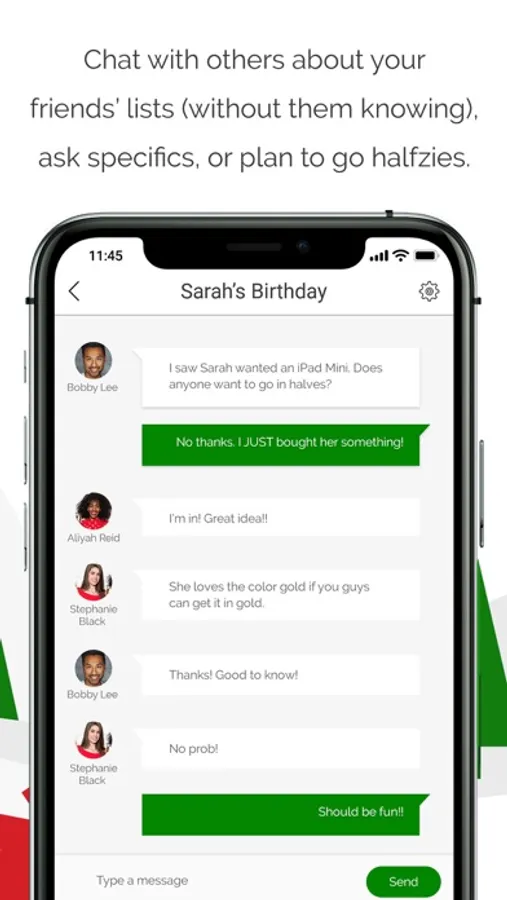 COLLABORATE - Discreetly chat with friends and family about others’ wish lists to suggest holiday gift ideas, reserve xmas gifts on others’ lists, making gift planning simple so that no one buys the same thing.