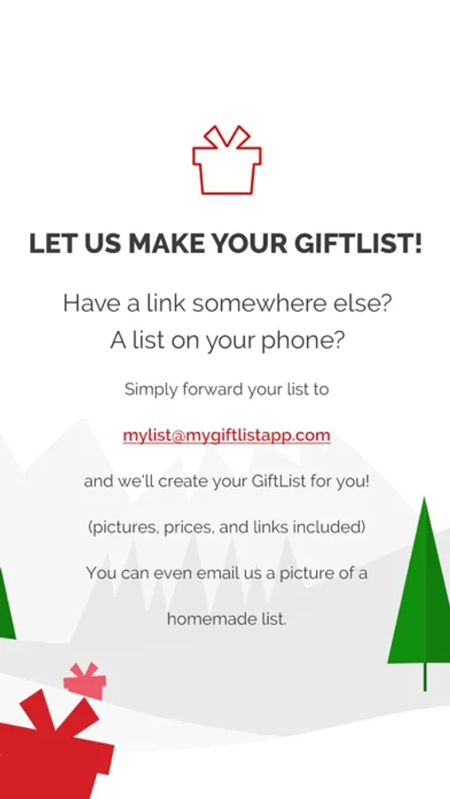 Send previously-created wish lists from other websites to mylist@mygiftlistapp.com or simply snap a picture/screenshot of a homemade Christmas giftlist and email it to us (using the email you registered with). Let us create GiftLists for you and help you start your Christmas wish list!