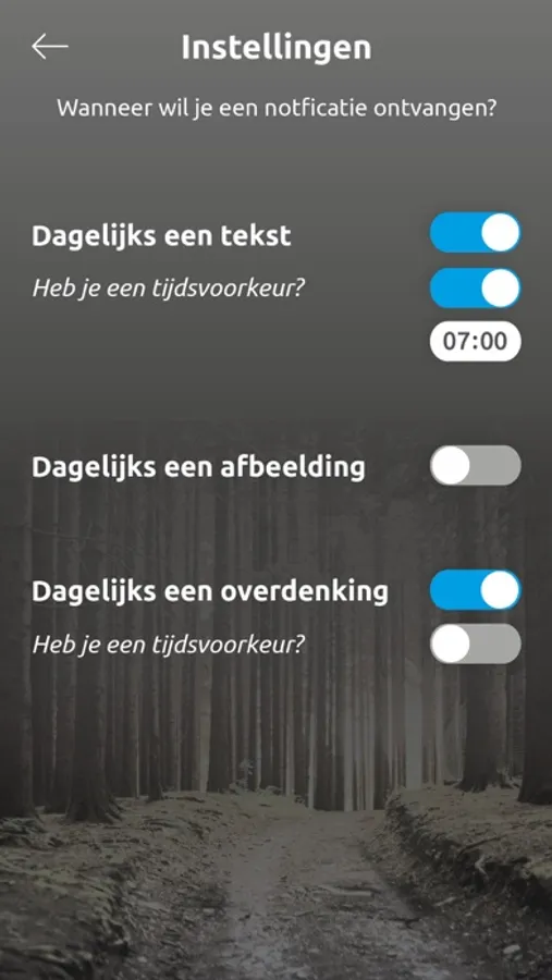 Je kunt per item een herinneringstijd instellen. Of... je geeft God de regie; kies dan voor een willekeurige tijd. Laat je hierdoor bemoedigen en inspireren op een willekeurig moment van de dag door een tekst, afbeelding of gesproken woord (melding zal plaats vinden tussen 07:00 en 22:00).