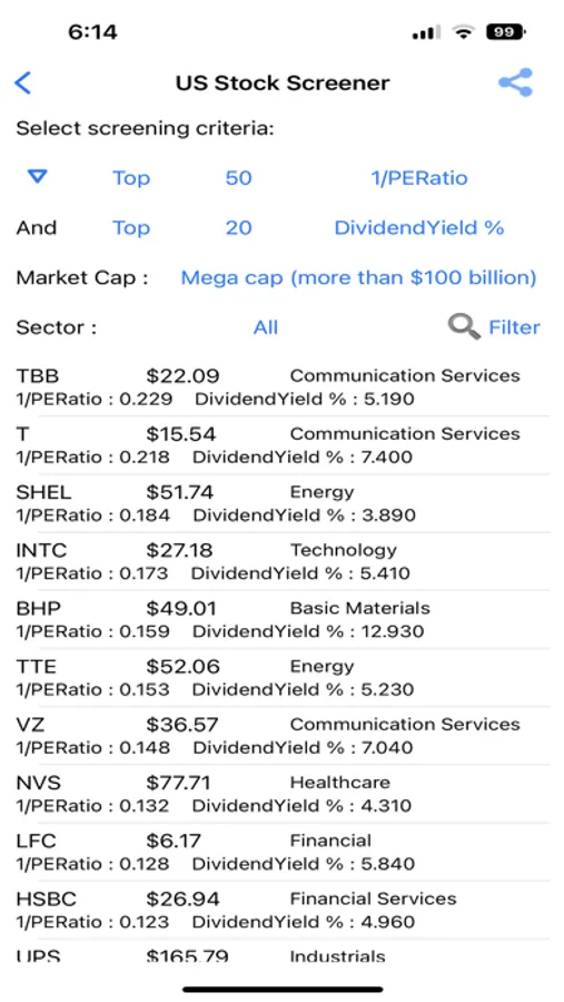 - US stock screener feature that retrieves matching stock tickers base on selected key statistics, can output and share screening results in CSV format.